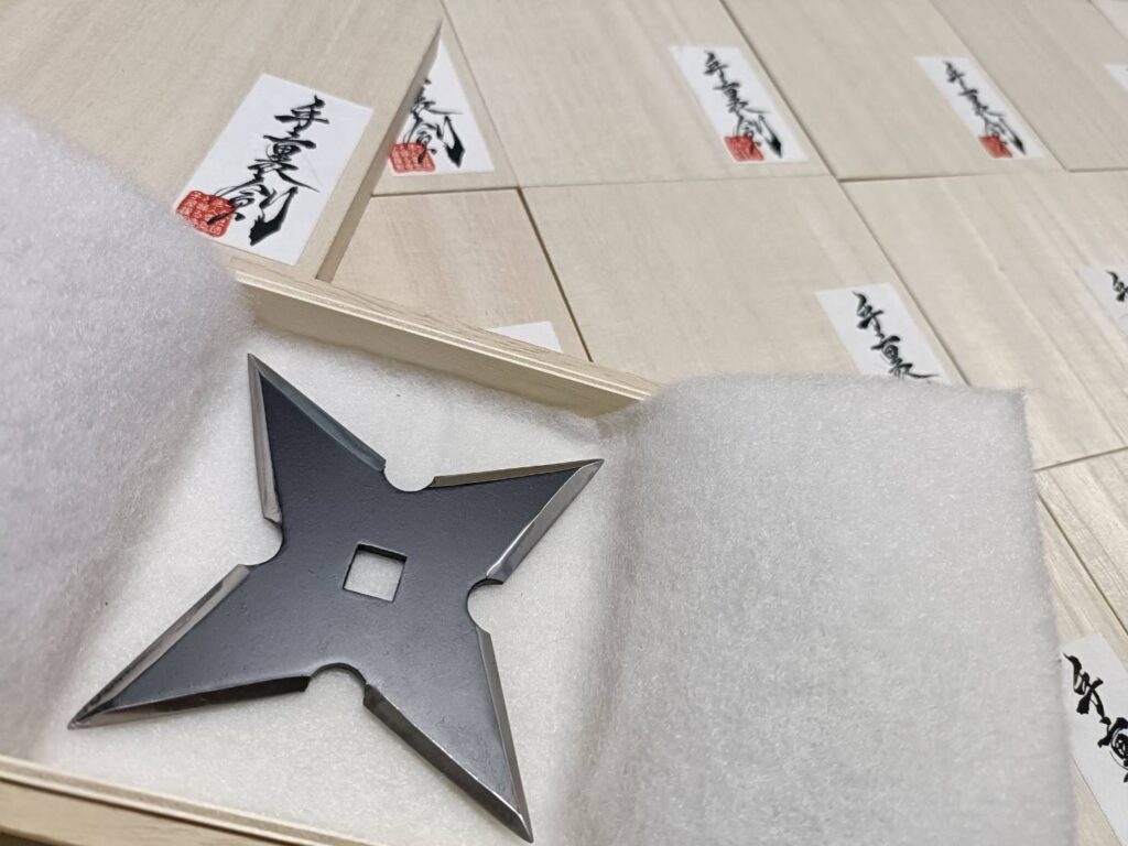 手裏剣本体は防錆紙で保護し、専用台紙とセットで木製の化粧箱に梱包して納品させていただきます。
