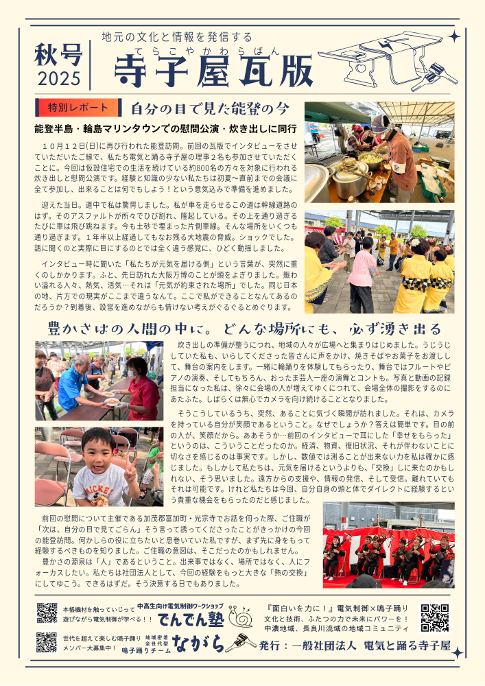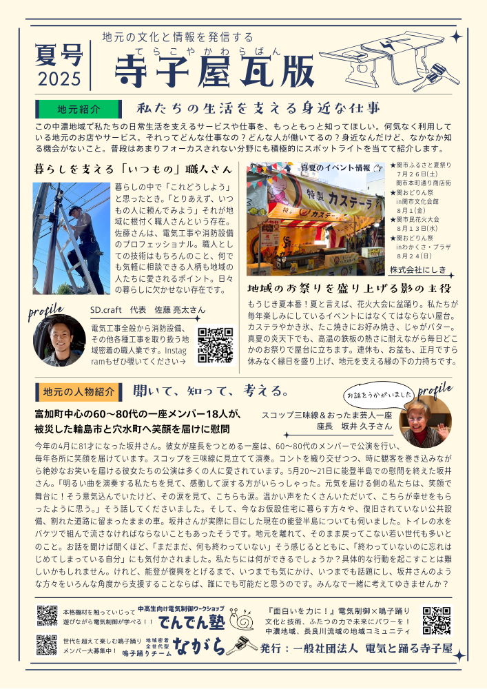 電気と踊る寺子屋では中濃地域の魅力を伝える瓦版を発行しています。瓦版の内容は地域文化についての豆知識や、活動レポート、地元の企業や人物紹介など。普段はあまりフォーカスされない分野にもスポットライトを当てて紹介してゆきます!